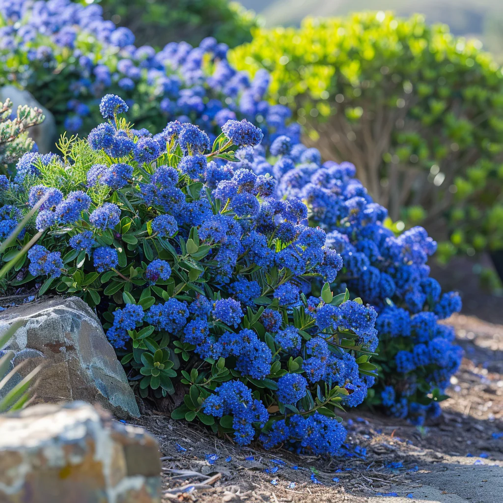 Weâre awfully fond of this ground-hugging California native, and with good reason. Ceanothus glorious âAnchor Bayâ makes a dense evergreen mound of dark, lustrous foliage that stays handsome all year, then absolutely lets loose in spring with a lavish display of bright blue flowers. Itâs a pollinator magnet, drawing in bees, butterflies, and other welcome garden visitors, and itâs especially fine spilling over slopes, softening borders, or rambling through naturalistic plantings. Tough, tidy, and very good-looking, it thrives in well-drained soil with little water once established, though inland gardens appreciate a bit of shade and occasional summer water. Deer resistant, drought tolerant, and wonderfully useful in dry California gardens. About 1â2' tall and 6â8' wide.