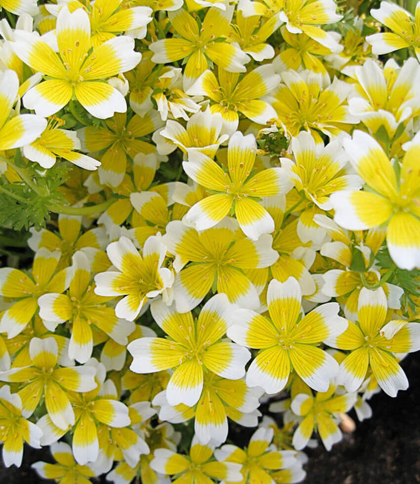 Adaptable and unfussy about soil, Limnanthes douglasii quickly settles in and spreads into a glossy, low, weed-suppressing mat up to 30 inches across. Slender 10-inch stems rise above the foliage, each crowned with masses of perfectly formed, one-inch flowers—crisp white petals delicately brushed with lemon-yellow at their centers, creating a refined two-toned display that seems almost painted by hand.